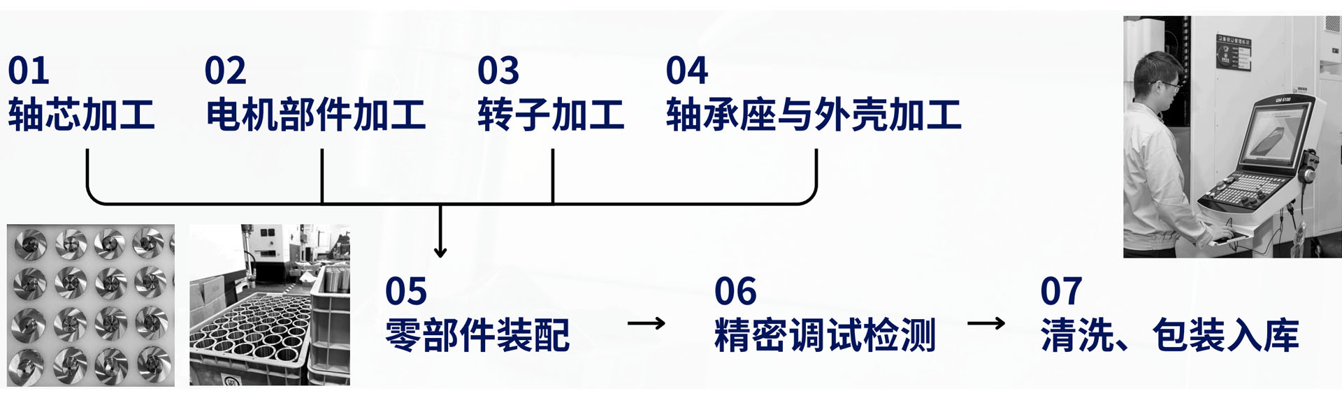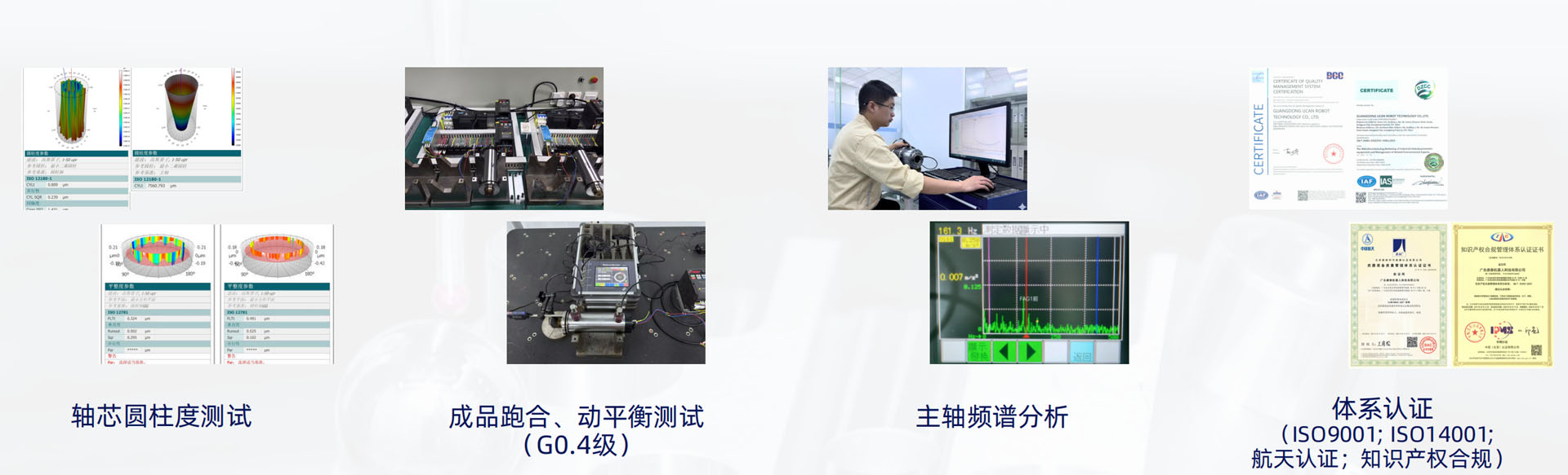 高精密加工与整装电主轴:轴芯加工、电机部件加工、转子加工、轴承座与外壳加工、零部件装配、精密调试检测、清洗、包装入库。并提供专业检测保障。